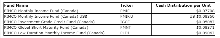 PIMCO Canada Corp. has declared the March, 2024, cash distributions for the exchange-traded fund series of the PIMCO Canada mutual funds that distribute monthly. Unitholders of record of the ETF series, at the close of business on March 21, 2024, will receive per-unit cash distribution payable on or about March 28, 2024.