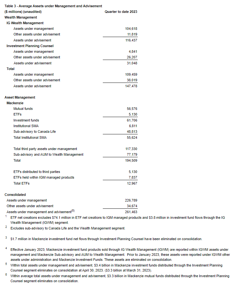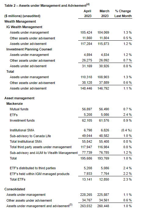 IGM FINANCIAL INC. ANNOUNCES APRIL 2023 ASSETS UNDER MANAGEMENT & ADVISEMENT AND NET FLOWS