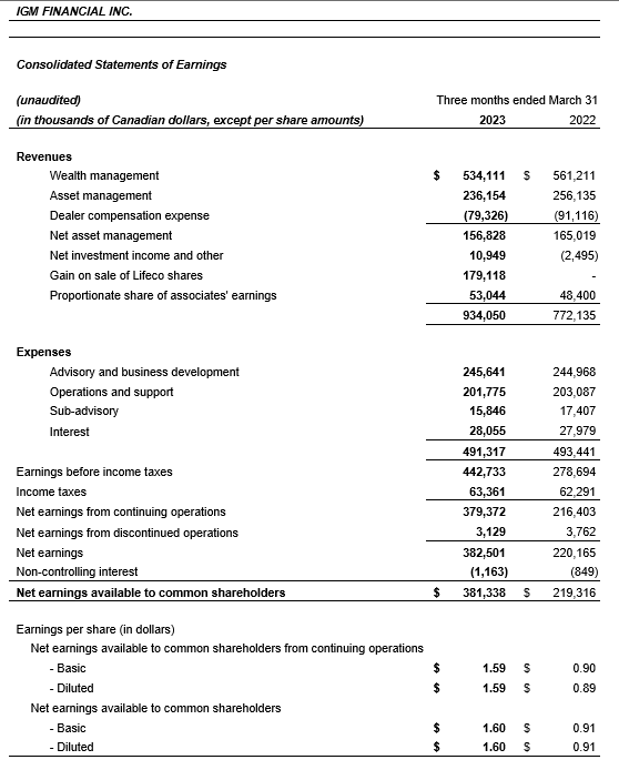 IGM Financial Inc. has released its earnings results for the first quarter of 2023.