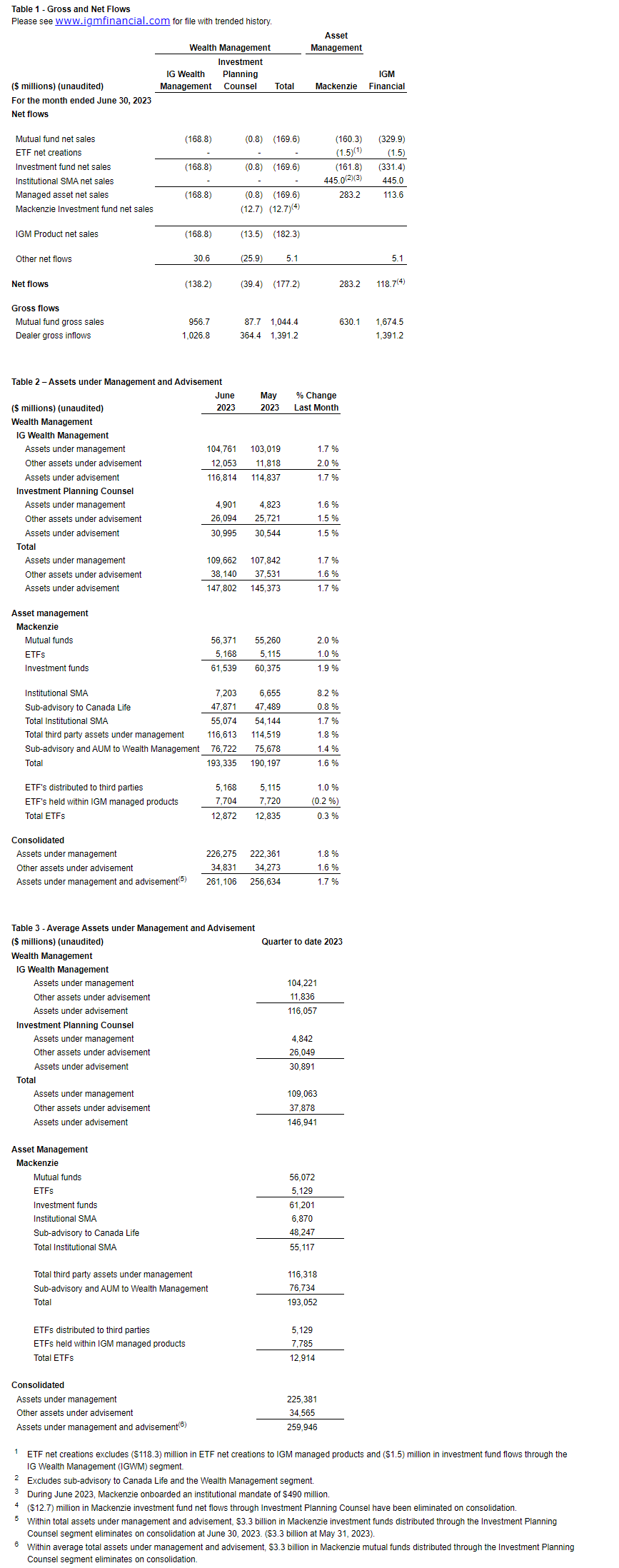 IGM FINANCIAL INC. ANNOUNCES JUNE 2023 ASSETS UNDER MANAGEMENT & ADVISEMENT AND NET FLOWS