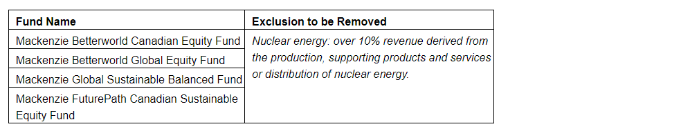 A change has been made to the investment strategy of each Mackenzie Betterworld fund listed in an attached table, to remove the exclusion of companies that derive over 10 per cent of revenue from nuclear energy. The changes will be effective on or about Sept. 29, 2023.