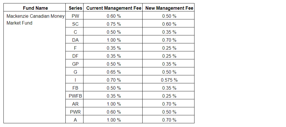 Mackenzie Investments has made changes to the risk rating and investment strategy of select mutual funds and exchange-traded funds, effective on or about Sept. 29, 2023, and to the management fee of certain series of Mackenzie Canadian Money Market Fund, effective on or about Oct. 2, 2023.