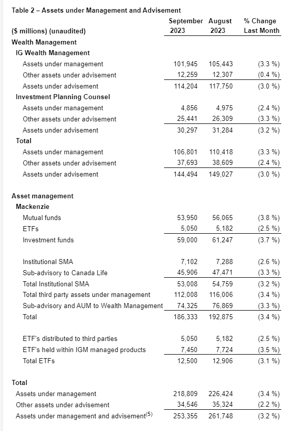IGM FINANCIAL INC. ANNOUNCES SEPTEMBER 2023 ASSETS UNDER MANAGEMENT & ADVISEMENT AND NET FLOWS