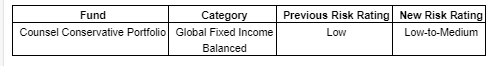 Counsel reviews and adjusts risk ratings in accordance with the risk classification methodology managed by Canadian securities regulators. Accordingly, the risk rating of Counsel Conservative Portfolio will change as outlined herein. This change will be effective Oct. 27, 2023, and does not reflect any alteration to the investment objectives, strategies or management of the impacted mutual fund.