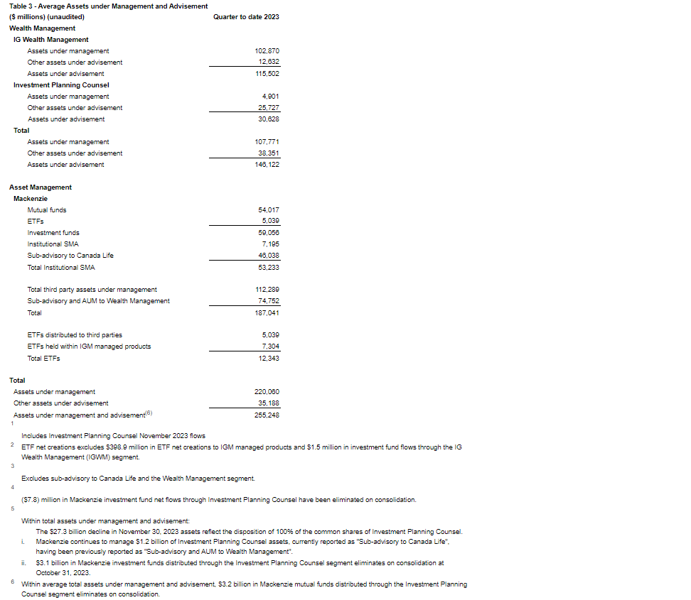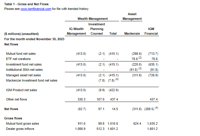 IGM FINANCIAL INC. ANNOUNCES NOVEMBER 2023 ASSETS UNDER MANAGEMENT & ADVISEMENT AND NET FLOWS