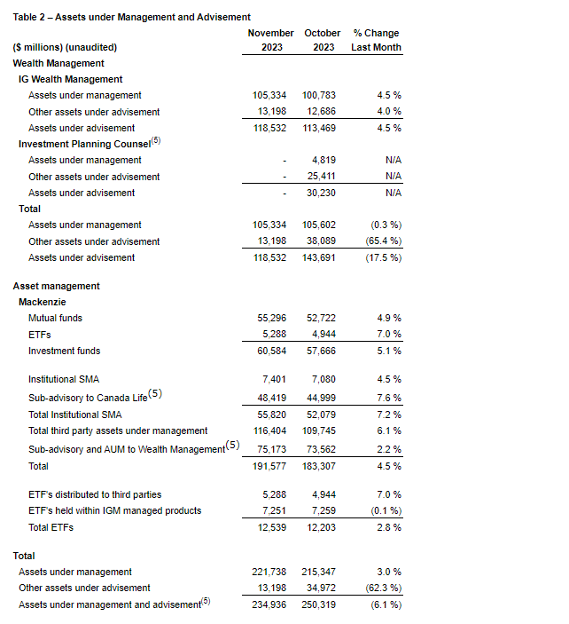 IGM Financial Inc. had preliminary total consolidated net outflows of $290-million during November, 2023, as shown in the first attached table. Total assets under management and advisement were $234.9-billion at Nov. 30, 2023, compared with $250.3-billion at Oct. 31, 2023, and $256.7-billion at Nov. 30, 2022. Due to the closing of the sale of 100 per cent of Investment Planning Counsel, total assets under management and advisement were reduced by $27.3-billion at Nov. 30, 2023. Total assets under management and advisement excluding Investment Planning Counsel increased by 4.7 per cent or $10.5-billion at Nov. 30, 2023. Assets under management and advisement are shown in the second attached table.