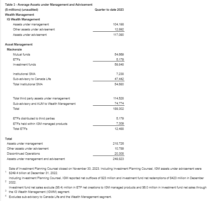 IGM Financial -- assets under management and advisement of $240.2-billion were up 2.2 per cent in the month. Total net outflows were $518-million compared with net outflows of $28-million in December, 2022. Investment fund net redemptions were $514-million compared with net redemptions of $390-million in December, 2022.