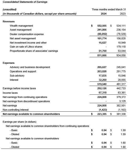 IGM Financial Inc. has released earnings results for the first quarter of 2024.