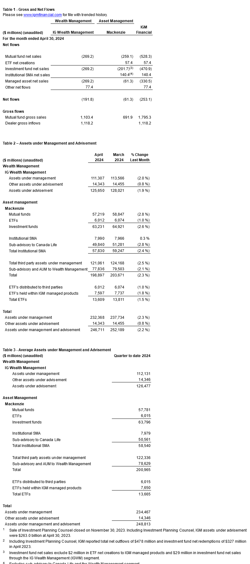 IGM FINANCIAL INC. ANNOUNCES APRIL 2024 ASSETS UNDER MANAGEMENT & ADVISEMENT AND NET FLOWS