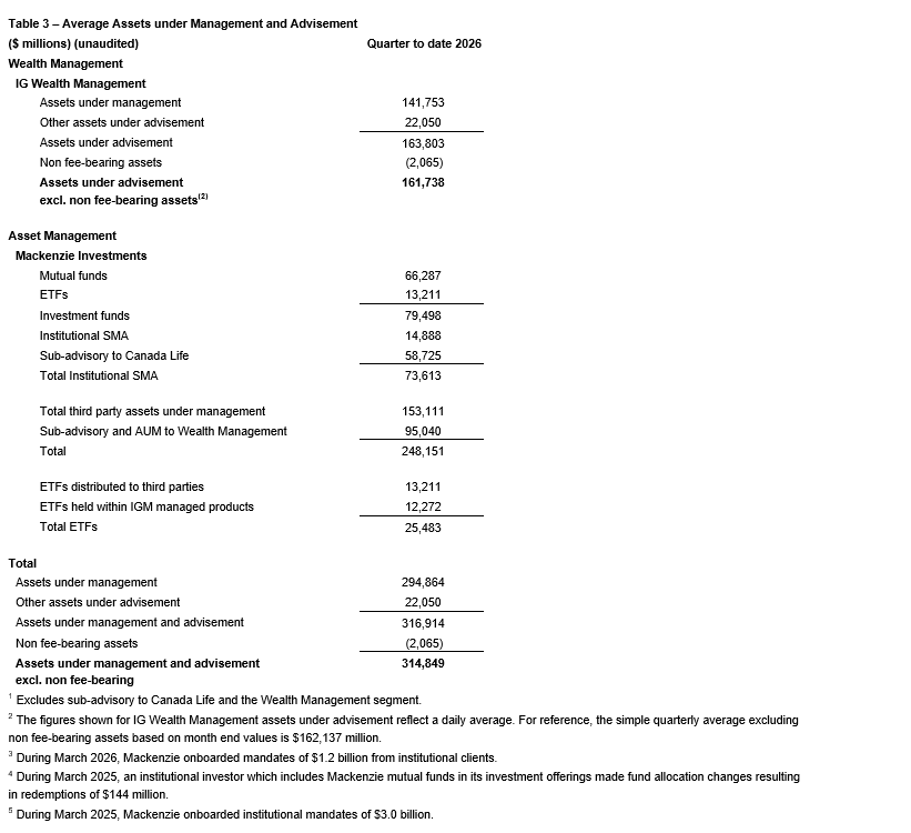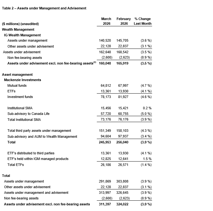 IGM FINANCIAL INC. ANNOUNCES MARCH 2026 ASSETS UNDER MANAGEMENT & ADVISEMENT AND NET FLOWS