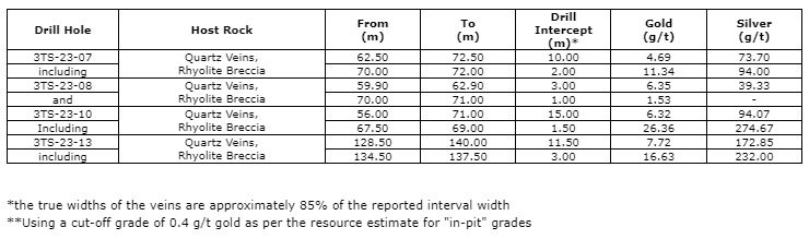 Drill holes 3TS-23-07, 3TS-23-08 and 3TS-23-10 targeted the central section Tommy vein within its currently known 1,075m strike length, and within the pit shell modelled by SGS Geological Services ("SGS"). A total of 13 drill holes were selected to target the pit in this current program in order to increase the resource model. These three holes were collared at 50m spacing along a north-south line. 3TS-23-13 was collared 130m south-southeast from 3TS-23-10 and tested for the continuity of the southern extension of the vein. The Tommy vein system remains open along strike and at depth.