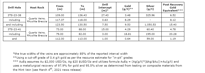 Drilling at the Mint vein system was designed to test key areas for additional assay data for a future update of the inferred resource. Drill hole 3TS-23-38 intersected 27.43 metres of mineralized quartz vein between 109 m and 136.43 m grading 3.48 g/t gold and 325.96 g/t silver.