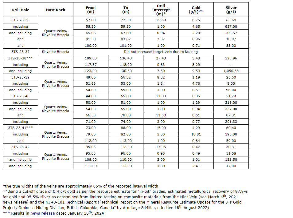 The Mint vein system is situated in the center of the 3Ts project striking north-south for approximately one kilometre. This vein system, along with the Ted and Tommy vein systems, has been tested under previous drill programs with results having contributed to the 2022 inferred resource as outlined in "Technical Report on the Mineral Resource Estimate Update for the 3Ts Gold Project, Omineca Mining Division, British Columbia, Canada;" please see the news release dated Aug. 18, 2022, for further details. The combined in-pit and underground components of the Tommy and Ted-Mint vein systems contain a total inferred resource estimate of 4,469,297 tonnes grading 3.64 grams per tonne (g/t) gold and 96.26 g/t silver, at a cut-off grade of 0.4 g/t gold equivalent (AuEq) in-pit and 2.0 g/t AuEq underground cut-off grade, containing 522,330 ounces of gold and 13,831,415 ounces of silver.