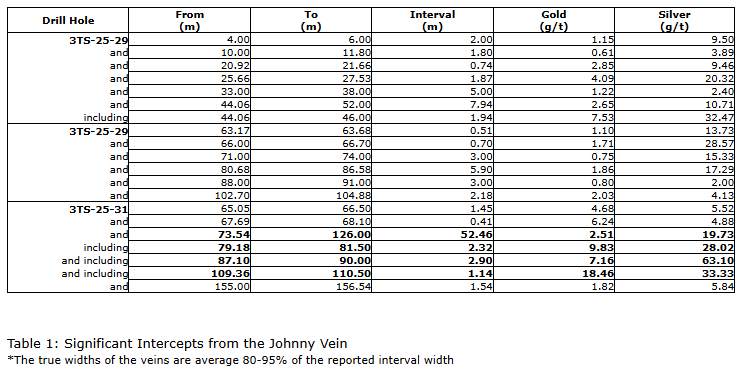 - Hole 3TS-25-29 returned 7.94 metres grading 2.65 grams per tonne gold and 10.71 grams per tonne silver (true width approximately 7.46 metres), including 1.94 metres of 7.53 grams per tonne gold and 32.47 grams per tonne silver.