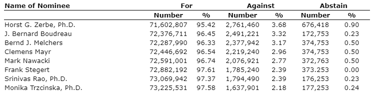 At IntelGenx Technologies Corp.'s annual meeting of shareholders held on May 9, 2023, shareholders voted in favour of all items of business put forth by the company, including the election of the directors, by a majority of the votes cast by shareholders present or represented by proxy.