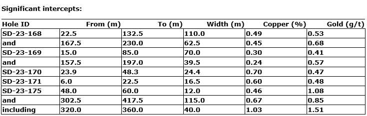 SD-23-175 is a 50-metre stepout to the east of SD-23-163 on Section 3160N. It intersected 0.67 per cent copper and 0.85 g/t gold over 115 metres from 302.5 metres and includes a higher-grade zone grading 1.03 per cent copper and 1.51 g/t gold over 40 metres from a depth of 320 metres.