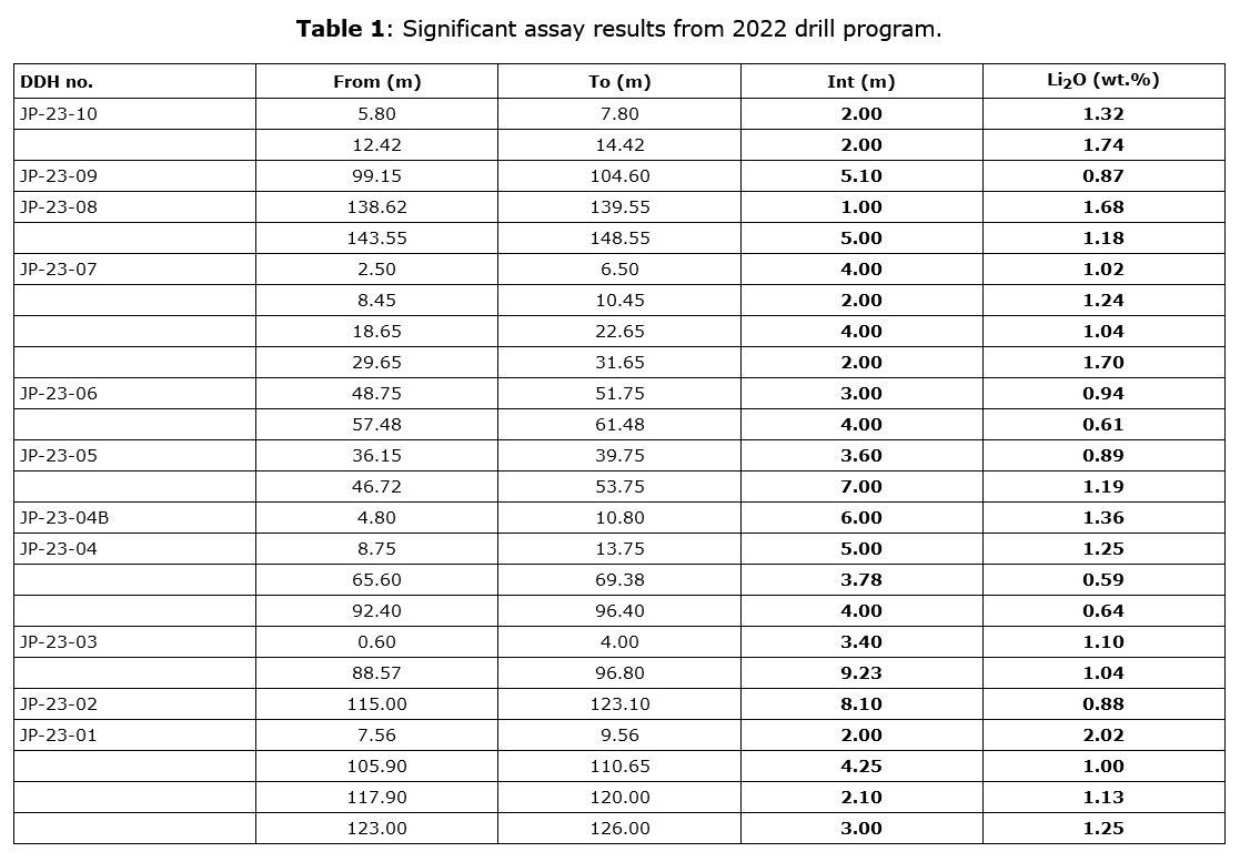 - Hole JP-23-03: 9.23 metres (m) at 1.04 per cent lithium oxide (Li2O);