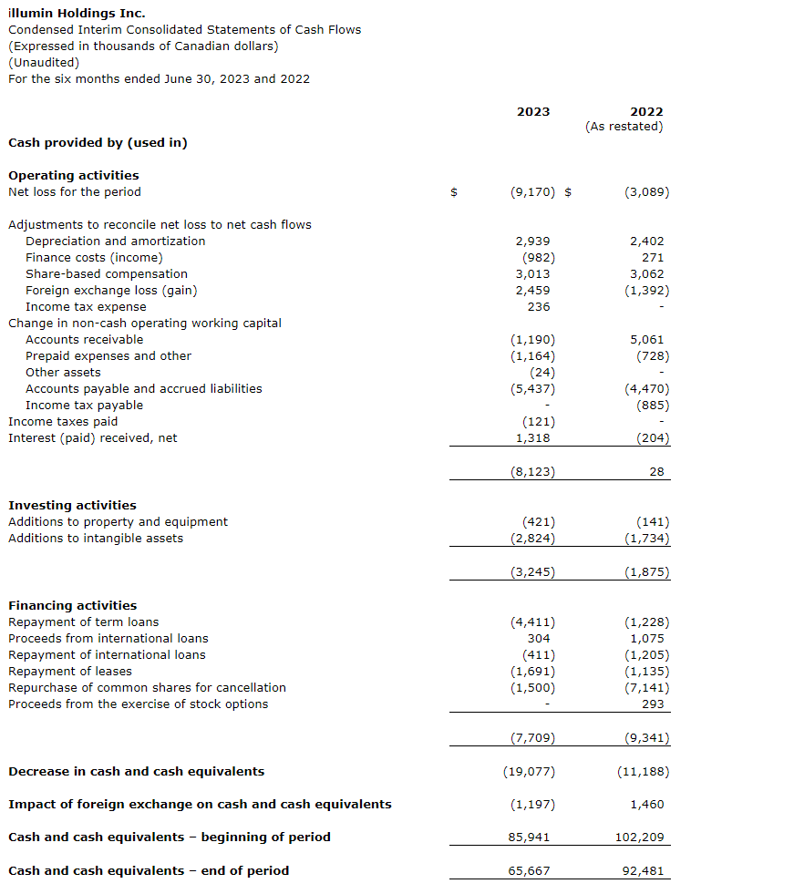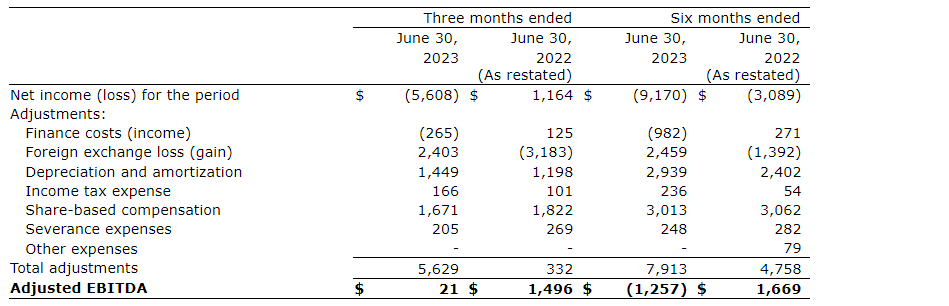 - Q2 2023 net loss was $(5.6)-million compared with net income of $1.2-million in Q2 2022, reflecting the previously mentioned strategic investments in Illumin and a foreign exchange loss of $2.4-million in the current period, compared with a gain of $3.2-million in Q2 2022.