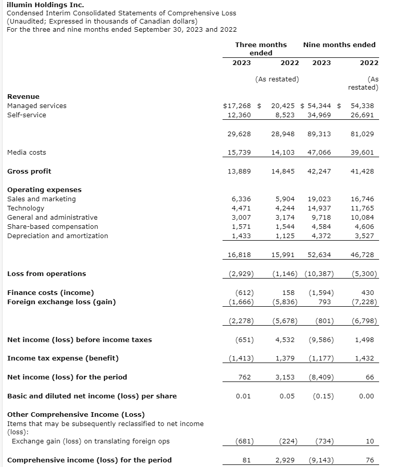 illumin Holdings Inc. has released its financial results for the third quarter ended Sept. 30, 2023. All monetary figures are expressed in thousands of Canadian dollars unless otherwise stated.