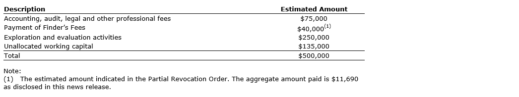 The company will use the net proceeds of the private placement for general working capital, and to prepare and file all outstanding continuous disclosure documents, and subsequently apply for and obtain a full revocation order. The proceeds of the private placement will namely be applied toward the following: (i) accounting, audit and legal fees associated with the preparation and filing of the relevant continuous disclosure documents; (ii) payment of the finder's fee in connection with the private placement; (iii) exploration and evaluation activities; and (iv) unallocated working capital as set out in the partial revocation order, as detailed in the attached table.
