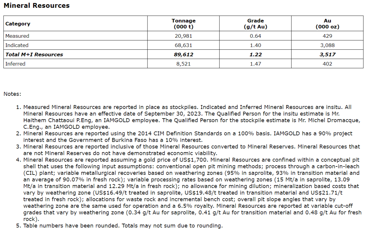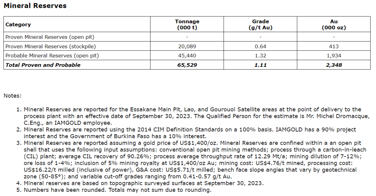 The "Technical Report on the Essakane Gold Mine, Sahel Region, Burkina Faso" that has an effective date of Sept. 30, 2023 was prepared by Mr. Francois J. Sawadogo, MAIG, Mr. Haithem Chattaoui, P.Eng., Mr. Remi Lapointe, ing, Mr. Michel Dromacque, C.Eng., Mr. Denis Doucet, ing, and Mr. Franck Napon, ing. for Iamgold Corporation. These individuals are each a Qualified Person ("QP"), as defined in NI 43-101, and have reviewed and approved the information contained in this news release that is derived from their respective sections of disclosure that is contained in the technical report.