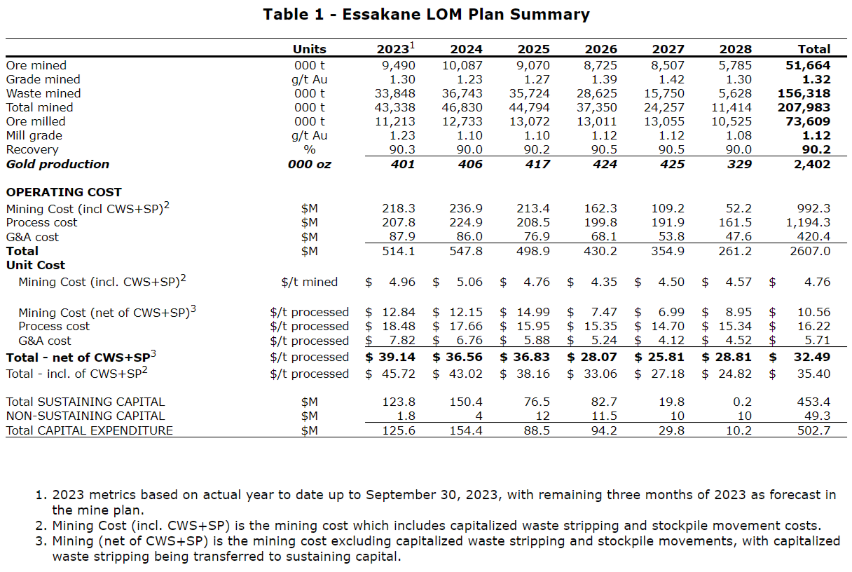 - Overall production of 2.4 million ounces of gold ("oz Au") from 2023 to 2028, with an annual average gold production of approximately 400,300 oz Au during this period;