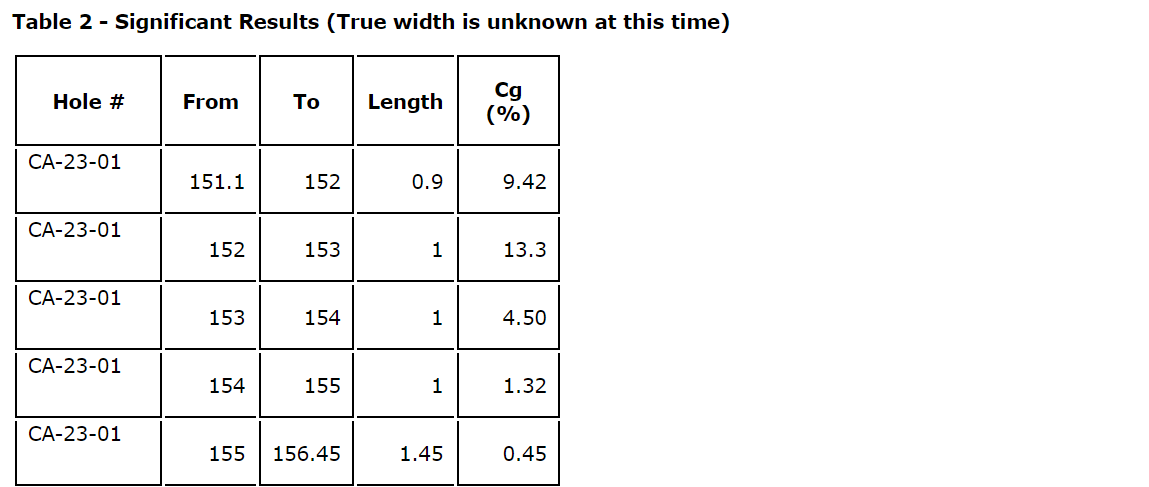 - 4.65 m at 5.11 per cent Cg, from 138.8 m, including 12.9 per cent Cg over 1.2 m (Zone A);