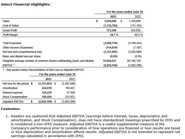 - Loss and comprehensive loss for the year ended June 30, 2023, totalled $3,331,491 or five cents per share, compared with a net loss of $3,292,699 or five cents per share for the year ended June 30, 2022.