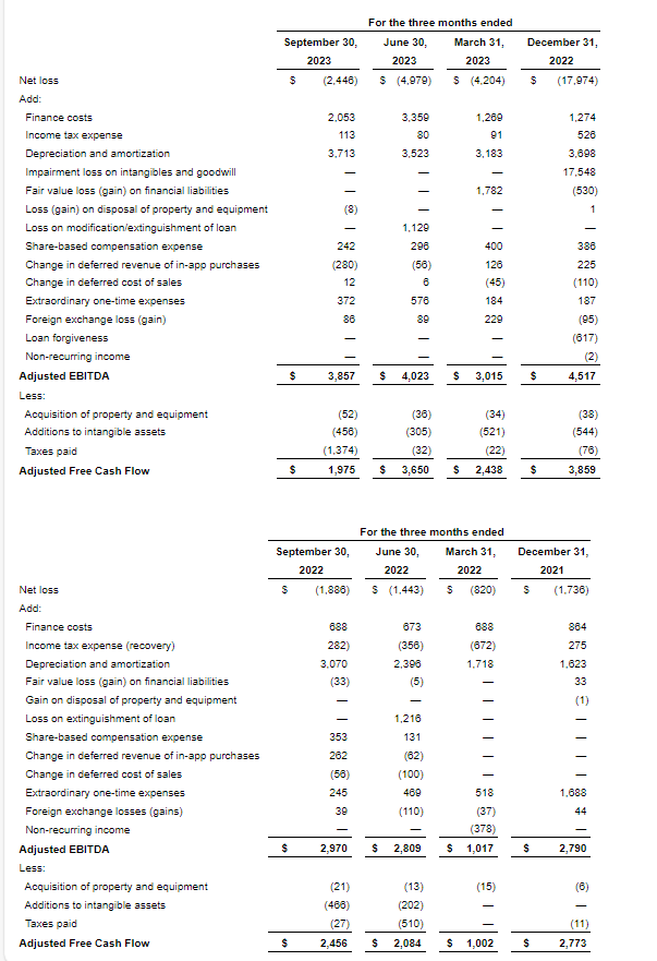 Adjusted EBITDA (earnings before interest, taxes, depreciation and amortization) of $3.9-million, compared with $4-million for the three months ended June 30, 2023, and $3-million for the three months ended Sept. 30, 2022.