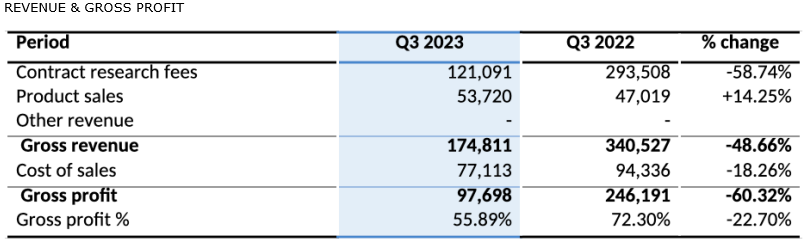 Innovotech Inc. had a third quarter loss of $117,546 on revenue of $174,811. Contract research revenues were $121,091, a decline from $293,508 in Q3 2022. Product sales remained relatively stable for the current quarter at $53,720.