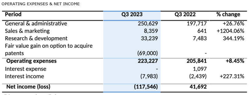 INNOVOTECH REPORTS RESULTS FOR ITS THIRD QUARTER ENDED 30 SEPTEMBER 2023