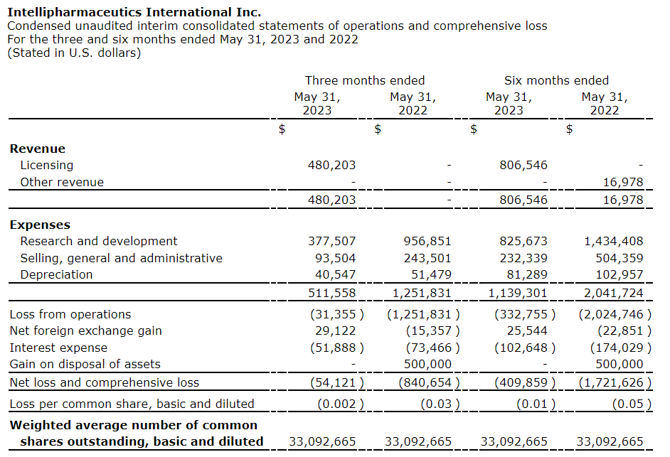 IntelliPharmaCeutics International Inc. has released the results of operations for the three and six months ended May 31, 2023. All dollar amounts referenced herein are in United States dollars, unless otherwise noted: