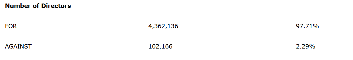 The number of directors of the company for the ensuing year was confirmed and set at three. The voting results on this matter are as shown in the attached table.