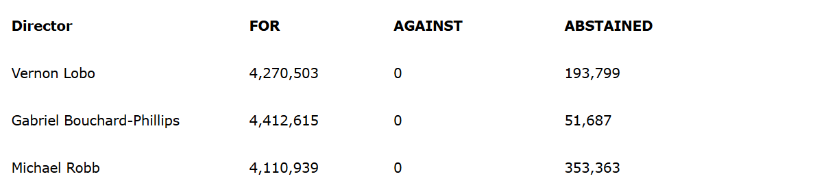 At the meeting, the company's shareholders reappointed McGovern Hurley LLP as auditor of the company for the 2025 to 2026 financial year. The voting results on this matter are as shown in the attached table.