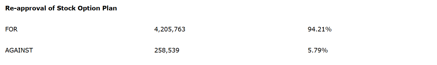 At the meeting, the company's shareholders reapproved the stock option plan. The voting results on this matter are as shown in the attached table.