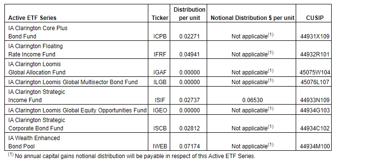 IA CLARINGTON INVESTMENTS ANNOUNCES ESTIMATED DECEMBER 2023 CASH AND ANNUAL NOTIONAL DISTRIBUTIONS FOR ACTIVE ETF SERIES, AND APPOINTMENT OF IA GLOBAL ASSET MANAGEMENT INC. AS PORTFOLIO MANAGER FOR SELECT FUNDS