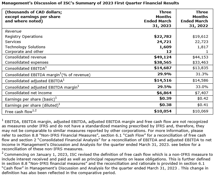 ISC REPORTS 2023 FIRST QUARTER FINANCIAL RESULTS