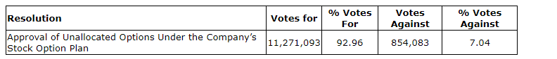 Detailed results of the vote for the approval of unallocated options under the company's stock option plan are provided in the attached table.