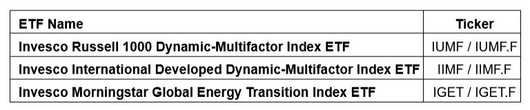 "Over five years ago, Invesco helped to pioneer the proprietary dynamic multifactor investing strategy utilized in these ETFs," explained Mr. Chiefalo. "We are excited to now provide Canadian investors flexibility and choice on how to access these strategies. We believe these ETFs can become important allocations in Canadian portfolios for U.S. and international equity exposures."
