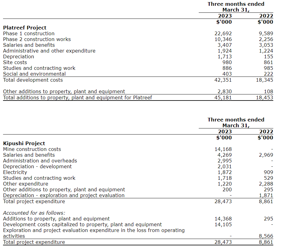 The main components of the additions to property, plant and equipment -- including capitalized development costs -- at the Platreef and Kipushi projects for the three months ended March 31, 2023, and for the same period in 2022, are set out in the attached table.