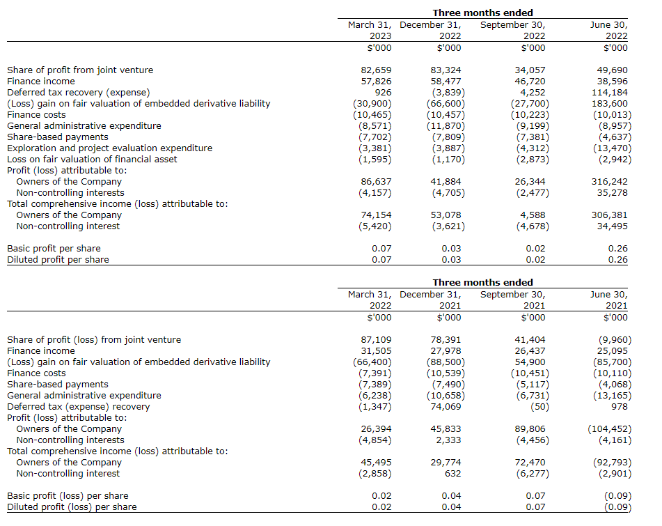 The company recorded a profit for Q1 2023 of $82-million compared with a profit of $22-million for the same period in 2022. The total comprehensive income for Q1 2023 was $69-million compared with $43-million for Q1 2022.