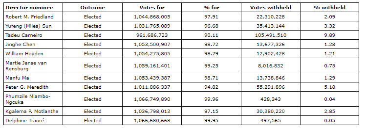 Voting results for election of directors