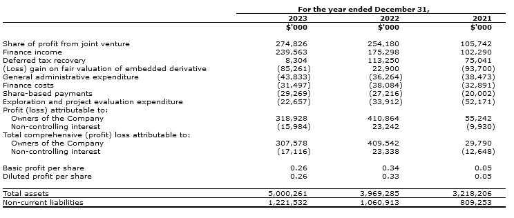 - Ivanhoe's profit for the year includes Ivanhoe Mines' share of profit and finance income from the Kamoa-Kakula joint venture of $482 million for 2023, up from $405 million in 2022.
