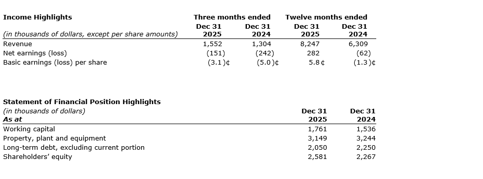 For the year ended Dec. 31, 2025, the corporation reported net earnings of $282,000, or 5.8 cents per share, on revenue of $8,247,000, compared with a net loss of $62,000, or 1.3 cents per share, on revenue of $6,309,000 for the 2024 fiscal year. For the three months ended Dec. 31, 2025, the corporation reported a net loss of $151,000, or 3.1 cents per share, on revenue of $1,552,000, compared with a net loss of $242,000, or 5.0 cents per share, on revenue of $1,304,000, for the same period in 2024.