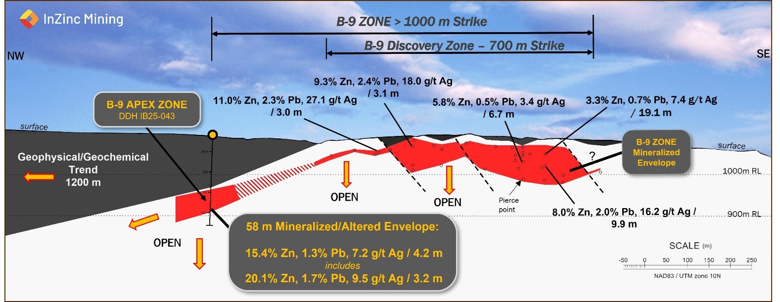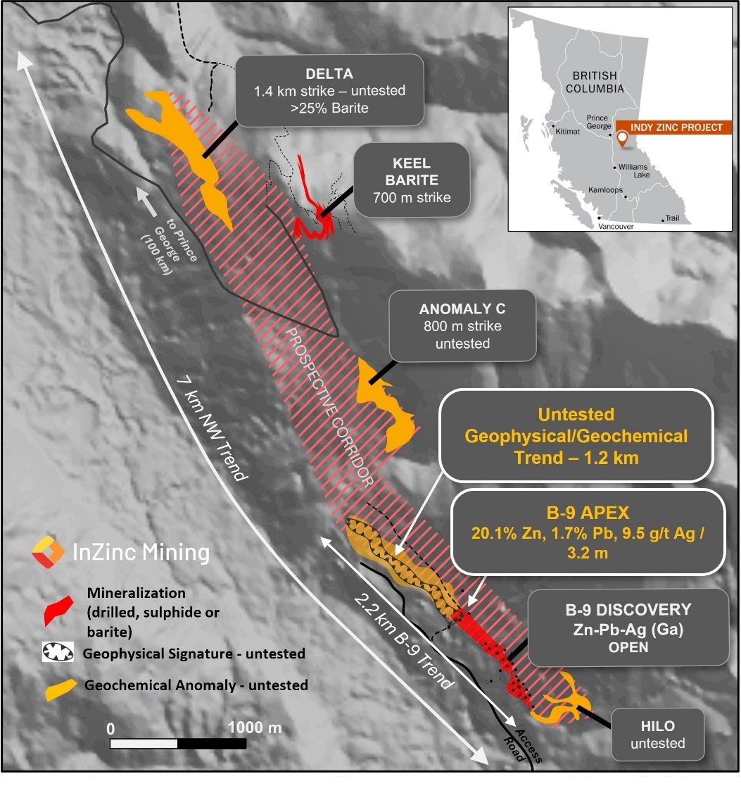 Vancouver, British Columbia--(Newsfile Corp. - March 11, 2026) - InZinc Mining Ltd. (TSXV: IZN) ("InZinc" or the "Company") announces recently reported very high-grade discoveries at the B-9 Zone (see NR25-09) are now recognised as replacement Sedex mineralization (B-9 Apex Zone) and are integral to the B-9 trend now totalling 2.2 km in length, of which 1.2 km remains untested. Near-surface primary mineralization, new replacement mineralization and along-strike prospects multiply the already significant discoveries achieved at the 100% owned Indy Sedex zinc-lead-silver-gallium-barite project, located 90 km southeast of Prince George in central BC, Canada.
