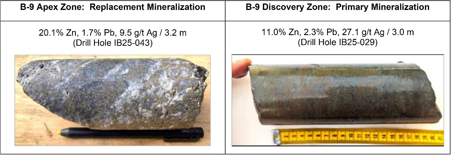 Drilling in late 2025 discovered the B-9 Apex Zone, including a very high-grade intersection containing 20.1% Zn, 1.7% Pb and 9.5 g/t Ag over 3.2 m (see NR25-09) within a broader mineralized and altered envelope 58 m wide (Figures 1 and 2). This mineralization is recognised as replacement Sedex mineralization. Identifying replacement mineralization is crucial in Sedex deposits as it signifies potential for increased metal grades, enlarged zones and distribution of economic minerals into multiple rock layers.