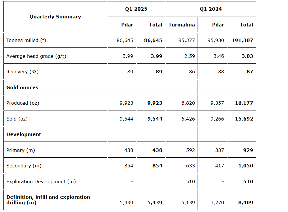 - Consolidated gold production was 9,923 ounces for the quarter and was solely from the Pilar mine, compared with 16,177 ounces produced in the first quarter of 2024, which included ounces produced from both the Pilar and Turmalina mines. The lower production year-over-year is the result of the loss of production from the Turmalina mine, which is currently suspended following a slump of material at its Satinoco dry-stack facility.