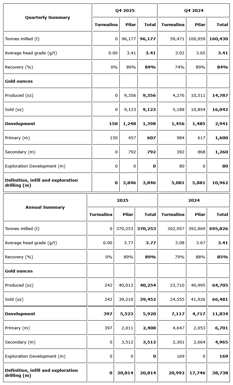 "For the full year, gold production from Pilar totalled 40,012 ounces, with an additional 242 ounces produced from Turmalina related to flotation concentration tests conducted on Faina ore in 2024 and shipped to a smelter in China in 2025, bringing total 2025 gold production to 40,254 ounces. This result was slightly above our expected production level of approximately 40,000 ounces, reflecting disciplined execution and the resilience of our operating teams.