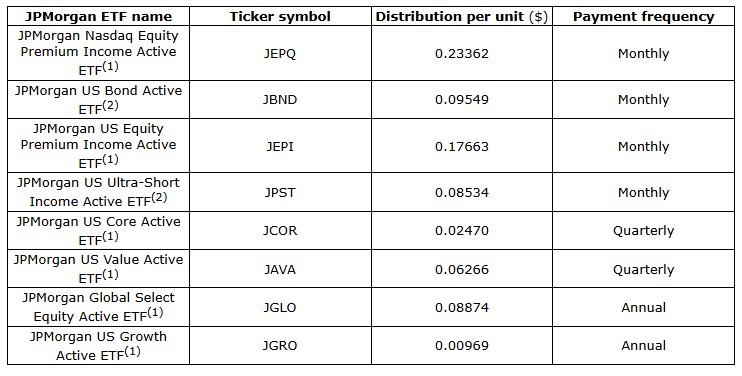 J. P. Morgan Asset Management has declared the final December, 2025, cash distributions for the below-listed JPMorgan ETFs (exchange-traded funds). The JPMorgan ETFs trade on the Toronto Stock Exchange. Unitholders of record on Dec. 31, 2025, will receive cash distributions payable on Jan. 9, 2026 (1), and Jan. 16, 2026 (2). Details of the per-unit distributions are as follows.