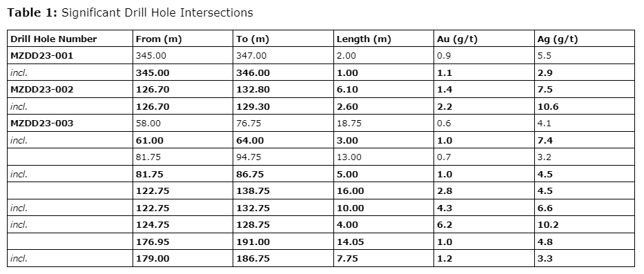 - MZDD23-002: 6.1 m at 1.4 g/t Au and 7.5 g/t Ag from 126.7 m (including 2.6 m at 2.2 g/t Au and 10.6 g/t Ag).